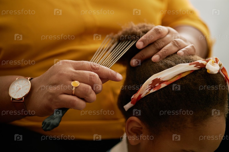 Женщина-старший стилирует девушек волосы с широкими зубными гребнями дома