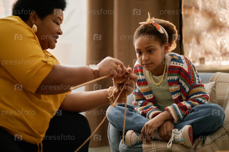 Черная девочка учится вязанию, а бабушка показывает технику дома