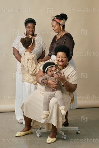 Многогенерационная семья с маленьким ребенком во время фотосессии в студии