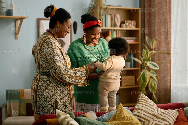 Две улыбающиеся чернокожие женщины держат ребенка, в то время как ребенок стоит на диване