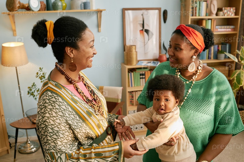 Две чернокожие женщины беседуют, держа ребенка дома
