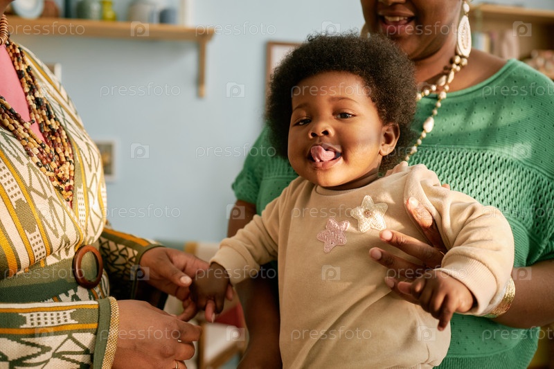 Маленькая черная девочка смотрит на камеру, в то время как мать держит ребенка дома