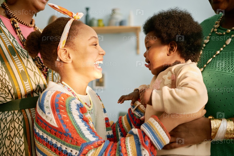 Улыбающаяся чёрная девушка держит ребенка дома Семейное собрание