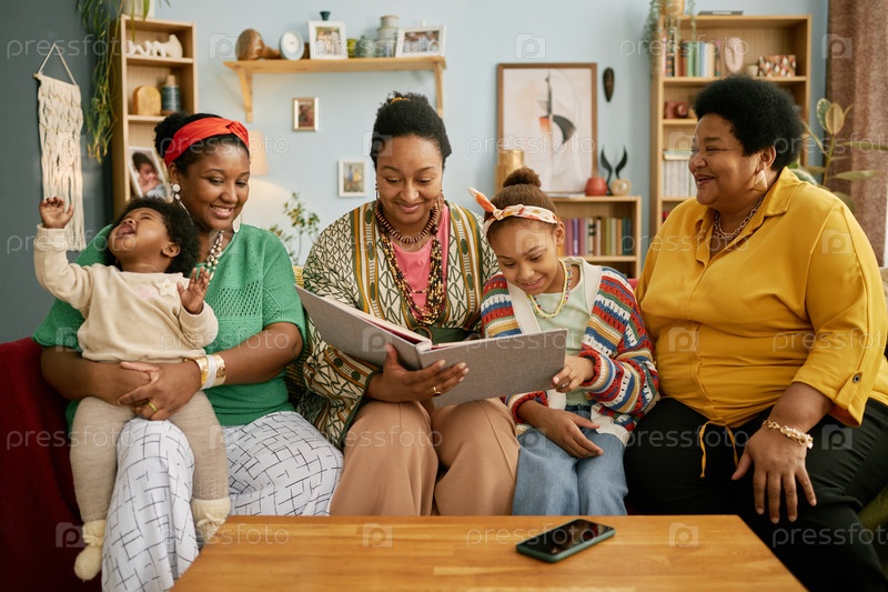 Члены семьи просматривают фотоальбом вместе дома