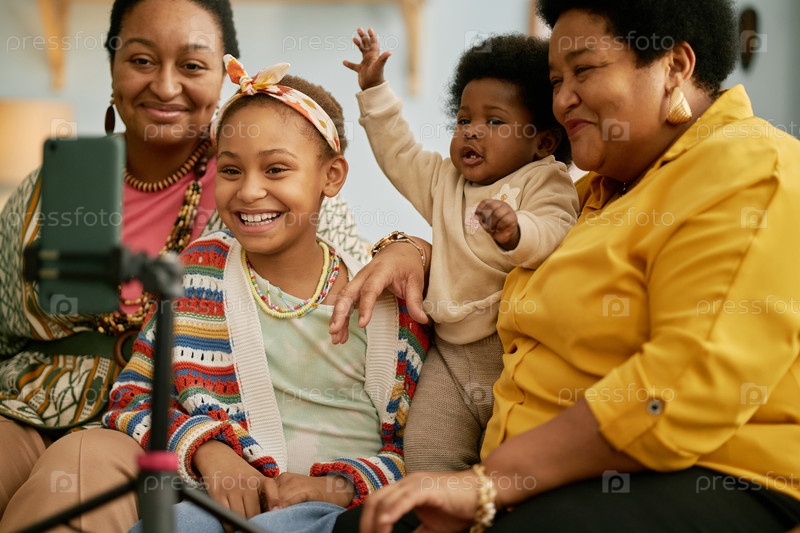 Мультигенерационная чернокожая семья снимает селфи на телефоне дома