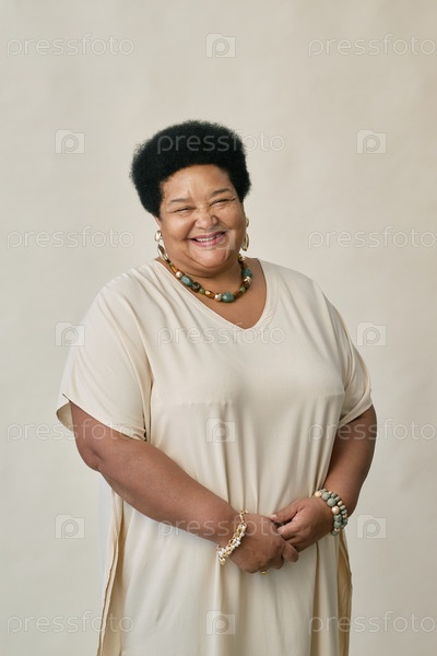 Улыбающаяся чернокожая женщина в нейтральном костюме позирует в студии