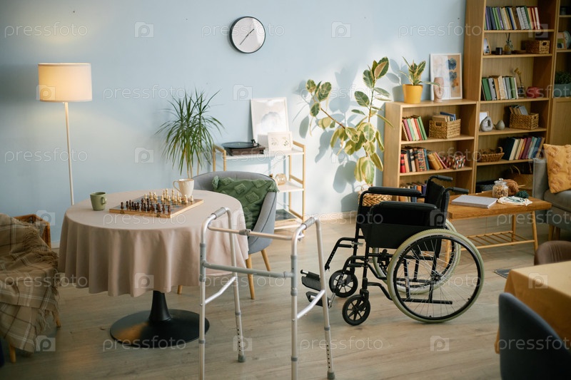 Уютная гостиная с медицинскими ходоками и инвалидной коляской