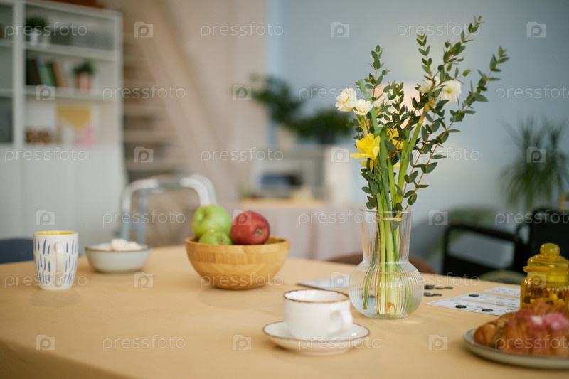 Запечатление стола для бранча с цветами и кофейной кружкой