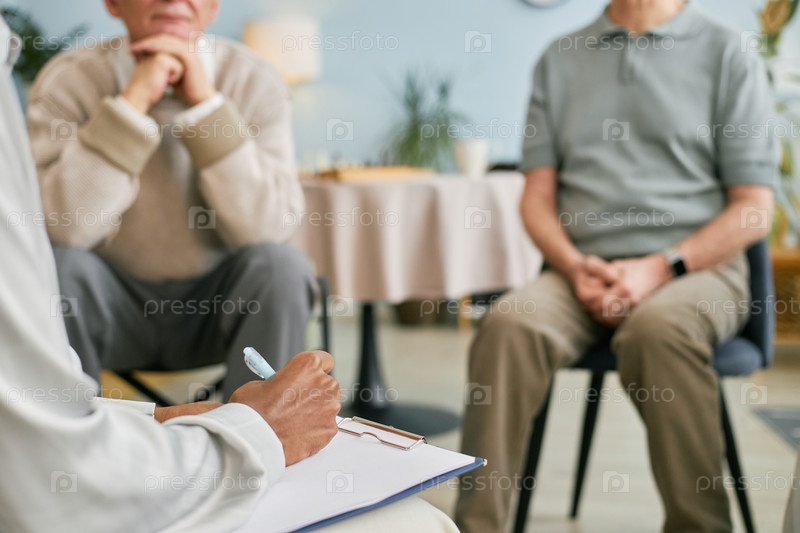 Пожилые люди, участвующие в групповом сеансе терапии в медицинском кабинете