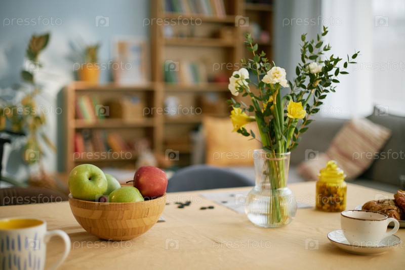 Свежие яблоки и цветы на деревянном столе в уютном доме