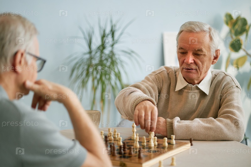 Старший человек играет в шахматы против другого старшего игрока