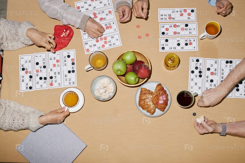 Пожилые люди играют в бинго со закусками и напитками за столом