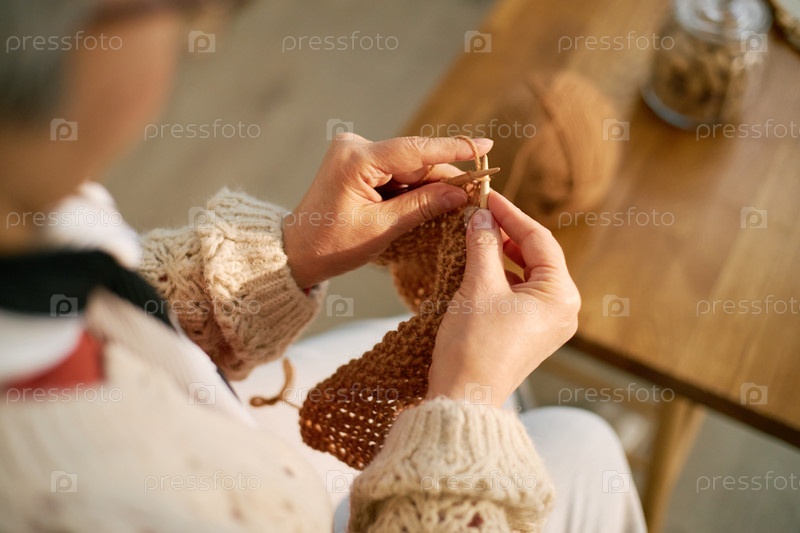 Пожилая женщина вяжет теплый свитер с деревянными иглами