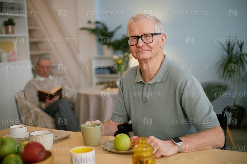 Портрет пожилого человека, завтракающего с другом на заднем плане