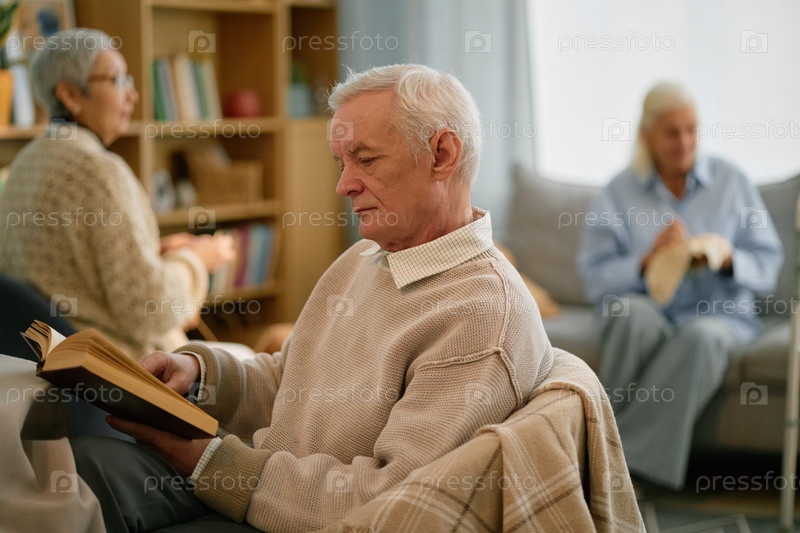 Пожилой мужчина читает книгу в уютной гостиной