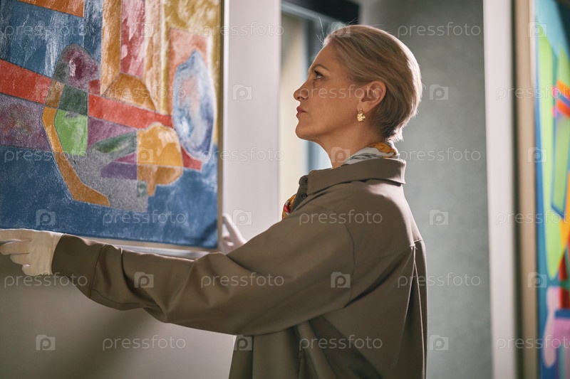 Женщина наблюдает за красочной абстрактной живописью в галерее