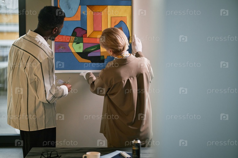 Изучение современного произведения искусства в галерее, собравшейся вместе