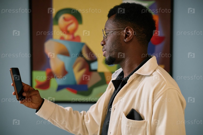 Афроамериканский мужчина смотрит на смартфон