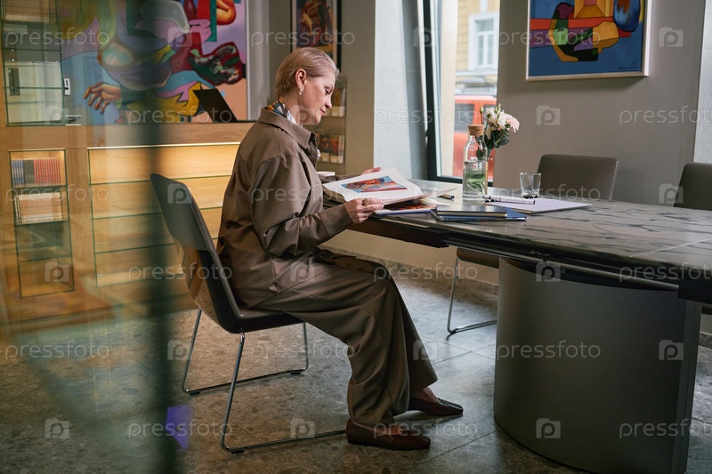 Пожилая женщина читает в комнате, заполненной искусством с естественным светом