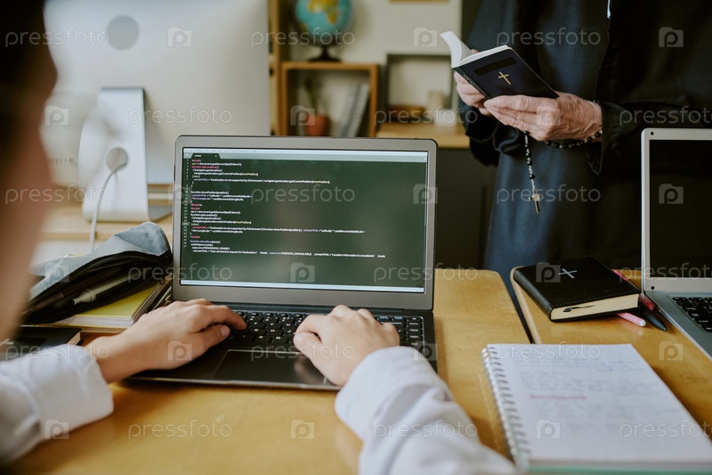 Урок кодирования с сосредоточенными студентами и членом духовенства