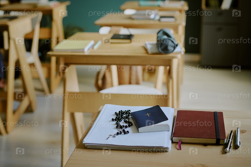 Подсветленный класс с столами и учебными материалами