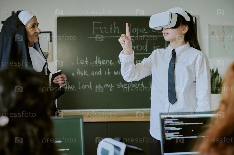 Ученица взаимодействует с виртуальной реальностью в классе