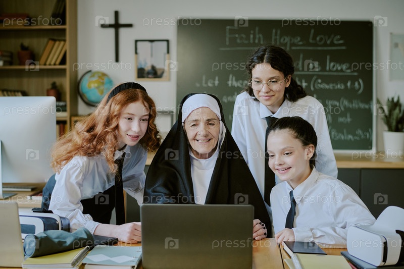 Взаимодействие с пожилой монахиней в окружении школьников