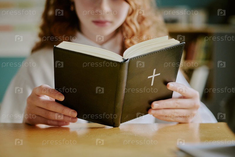 Читая религиозную книгу с крестом на обложке