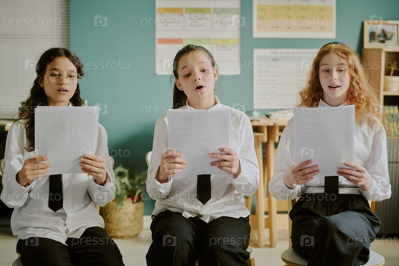 Три школьницы поют и держат лист музыки