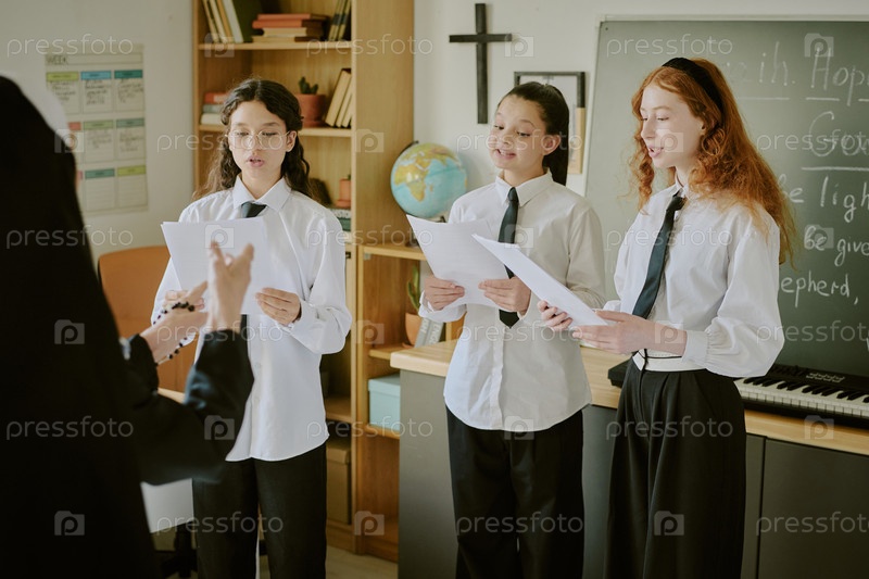 Группа учеников, поющих в классе рядом с учителем