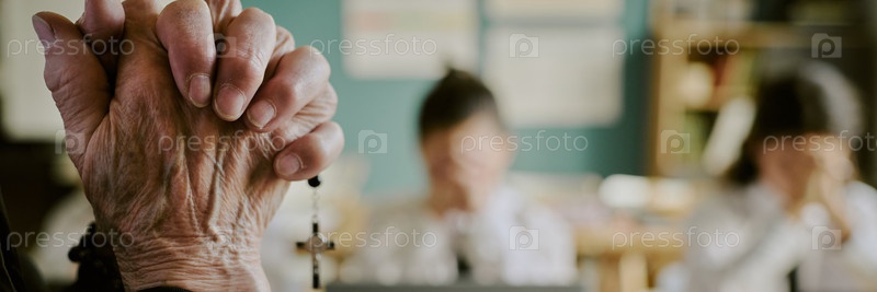 Старший, держащий Розарий в молитве с размытым фоном