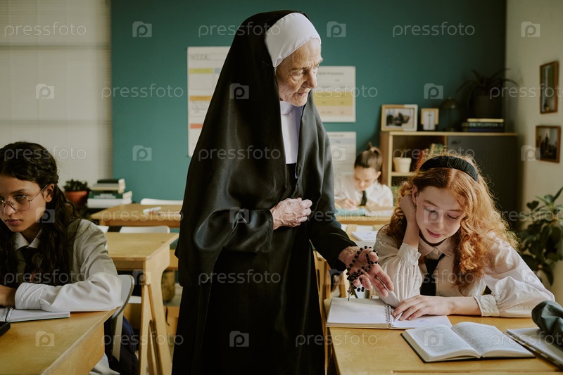 Монахиня в классе Преподавание Занимается учащимися усердно