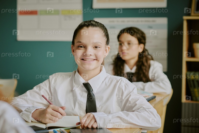 Портрет улыбающейся школьницы, сидящей в классе