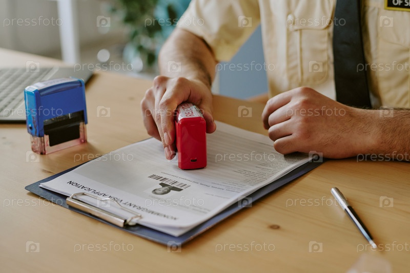 Офисный работник штампирует документ в профессиональном рабочем пространстве