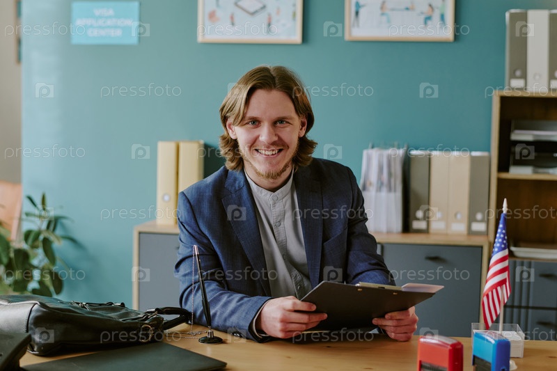 Портрет улыбающегося мужчины, держащего клипборд в офисной обстановке