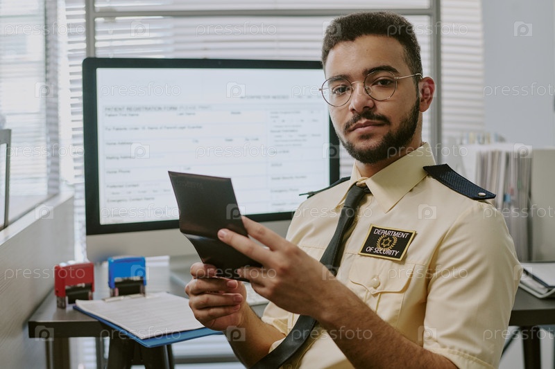 Портрет сотрудника службы безопасности, держащего документ в офисе