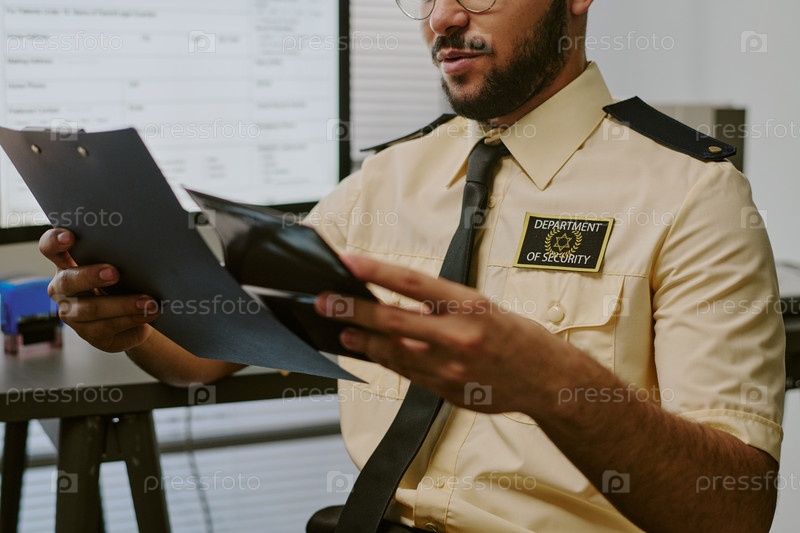 Охранник просматривает документы на столе