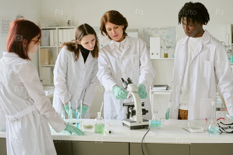 Группа ученых, наблюдающих эксперимент под микроскопом