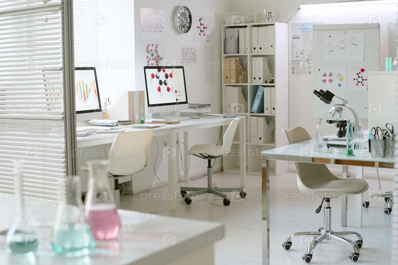 Лаборатория с исследовательским оборудованием и современным белым интерьером