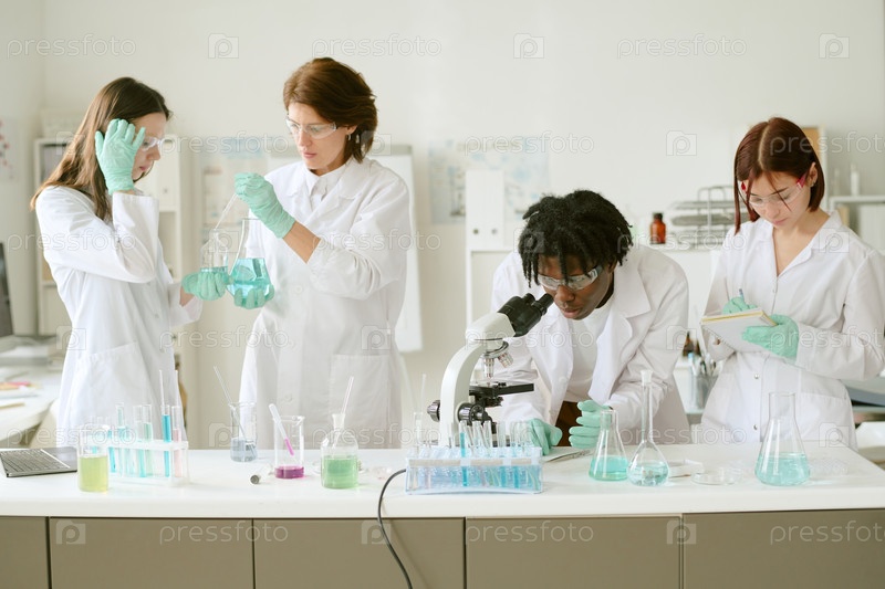 Ученые, сотрудничающие в современной исследовательской лаборатории