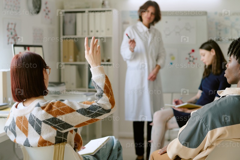 Разнообразная группа учеников в классе взаимодействует с учителем