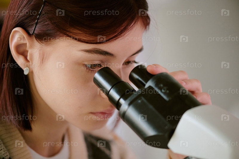 Концентрирующийся студент с помощью микроскопа для научных исследований