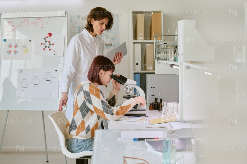 Обучение студента использованию микроскопа в научной лаборатории