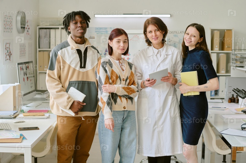 Группа разнообразных студентов, стоящих в кабинете