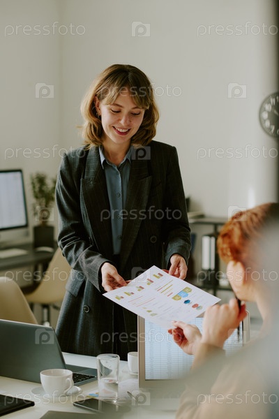 Улыбающаяся деловая женщина обсуждает отчет о продажах в офисе