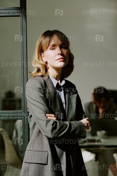 Портрет уверенной деловой женщины в сером костюме в офисной обстановке