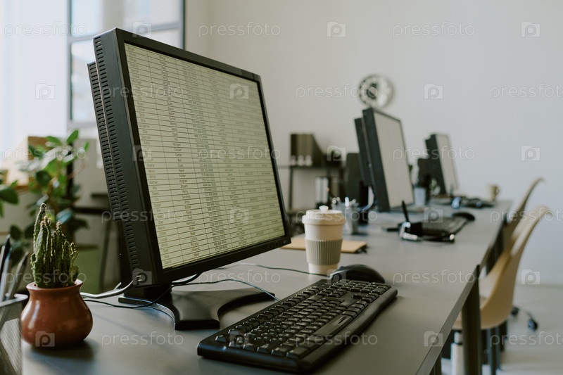 Пустое рабочее место в офисе с компьютерами и чашками для кофе