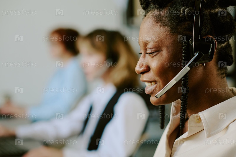 Улыбающийся представитель службы обслуживания клиентов, носящий наушники