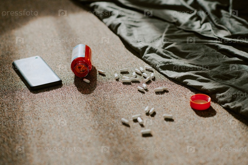 Пролитые таблетки на ковре с мобильным устройством поблизости