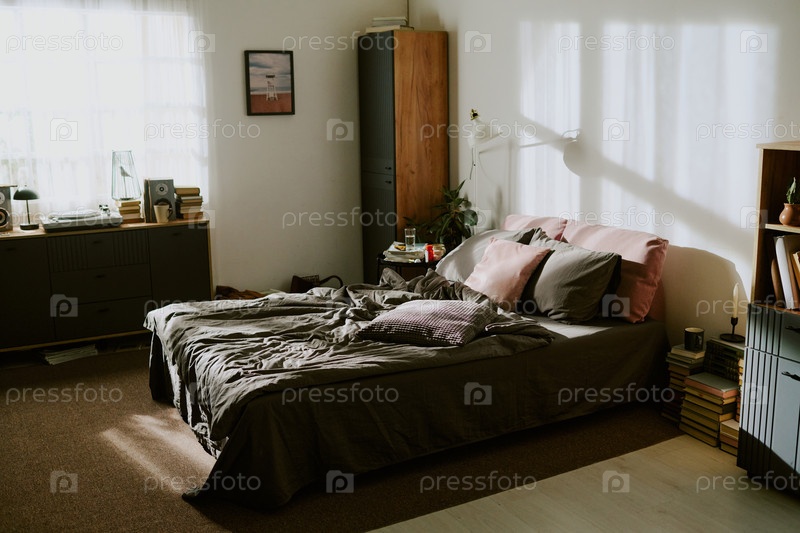 Уютная солнечная спальня с беспорядочной кроватью и открытыми книгами